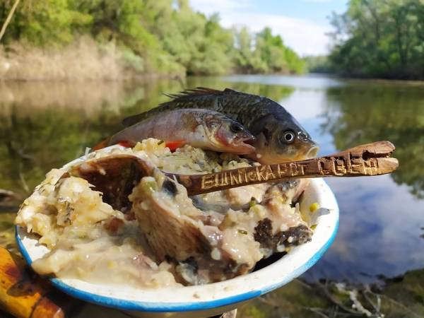 Власне це була не класична рибна юшка. І навіть не рибний супчик. Є угорці таке блюдо, як «бограч». Точно не пам'ятаю його рецептуру, щось на зразок борщового варева, в якому намішано всякої м'ясної та овочевої всячини. Таким і виявився мій похідний кондер, у який я накришив і пшона, і картоплі, і молодої кукурудзи, і помідорину, і зелень.