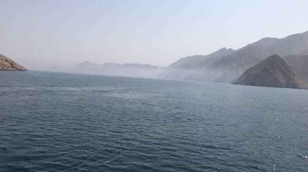 Виходимо до Оманської затоки, йдемо вздовж берега. Невисокі гори, де-не-де на схилах виживають кущі. Дуже жарко, рятує легкий морський бриз. Вода блакитна, чиста, на місці першої стоянки видно піщане дно.