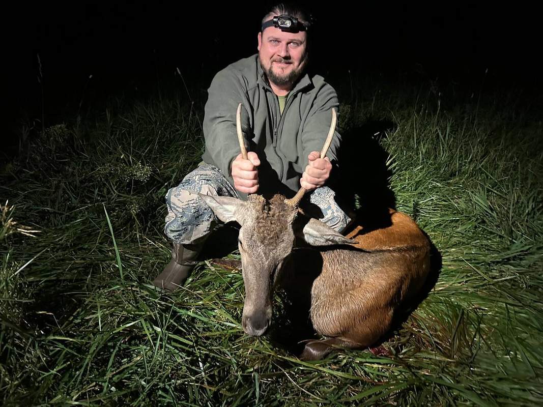Я разом з іншим фахівцем лісгоспу сідаю на вежу з Mauser 66 7×64 і тепловізором Longot. На полі прямо на увазі вишки – як мінімум чотири рогалі. Усі вони повільно рухаються, я сказав би, перебувають у броунівському русі: постоять на місці, поревуть, увійдуть у ліс, вийдуть із лісу. Насправді непосвяченій людині і не зрозуміти, скільки їх поряд – місцеві фахівці, можливо, в цьому розуміються, але не я. Ми вибираємо непоганого бика за сто двадцять метрів від вишки – постріл! Олень затримується на місці, відходить трохи убік і знову починає ревти. “Не стріляй, зараз впаде”, – шепоче Михайло. Але нічого не відбувається, звір ще раз реве, потім ховається частіше. Михайло припускає підранка, я ж підозрюю, що взагалі не потрапив: якось не віриться, що після удару десятиграмової кулі, випущеної зі швидкістю 860 м/с, звір ще може виявляти якусь активність, тим більше сексуальну. Наступного ранку йдемо дивитися місце стріла: крові немає, звіра в найближчих кущах – теж. (Пізніше я дізнався, що наплутав із налаштуваннями тепловізора, – простіше треба жити, простіше!).