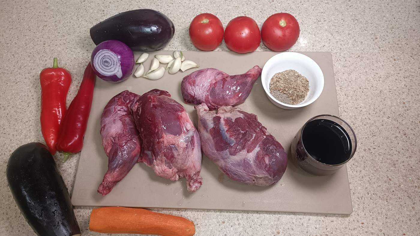 Для приготування 1,5 кг бобрятини потрібно 3–4 великих помідори, два солодкі перці типу «ромеро», 2 великі баклажани, одна велика морквина, одна велика червона цибулина, 200 мл червоного сухого вина, 8–9 зубчиків часнику або столова ложка з гіркою сухою “французьких” трав), сіль і чорний свіжомелений перець за смаком, 1 великий лимон або виноградний оцет для вимочування, олія для обсмажування.