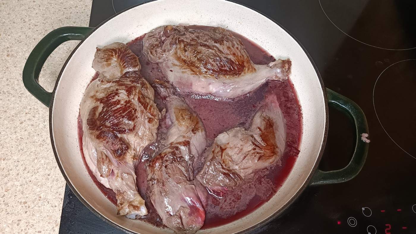 Після вимочування ретельно обсушіть шматки або шматочки кухонним рушником і злегка обсмажте на розігрітій олії. Не намагайтеся повністю просмажити шматочки: ваше завдання полягає в тому, щоб отримати рум'яну скоринку. Складіть усі обсмажені шматки і шматочки в ємність для гасіння, влийте вино і рівну кількість води, закрийте кришкою і загасіть при слабкому (бульбашковому) кипінні 1 годину.