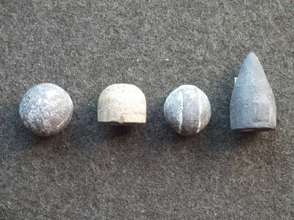 Свинцеві кулі: сферична, ковпачкова Нейслер для гладких стовбурів; сферична та «циліндрострельчаста» Куликовського для двонарізного штуцера