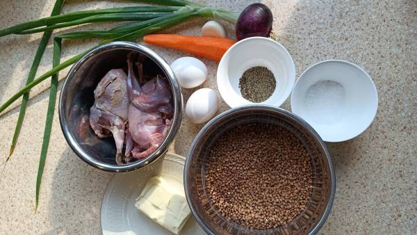 Для приготування каші з двох рябчиків знадобиться 400 г гречки, два яйця, одна невелика цибулина, 100 г вершкового масла, одна невелика морквина, сіль та чорний свіжомелений перець за смаком, олія для смаження.