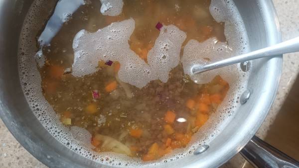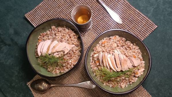 Коли рябчики зваряться, процідіть бульйон і залийте ним гречку, додайте обсмажену цибулю і моркву і поставте варитися. На зазначену кількість крупи потрібно приблизно 850 мл рідини.