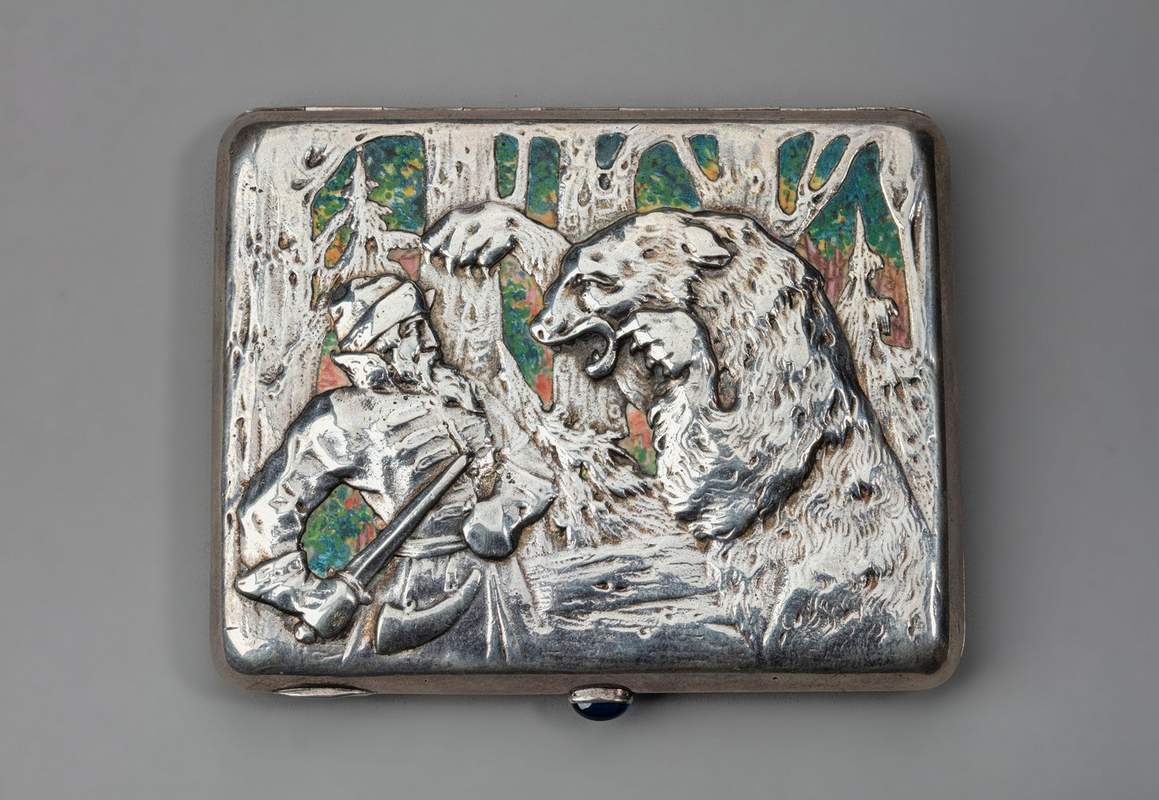 Далі – чудові зразки російської мисливської бронзи, що включають оригінальну скульптуру Лансере, кілька композицій із ведмедями. Срібні портсигари (на кришках яких теж домінує «ведмежа» тема). Знаходжу я і відбиток моєї улюбленої гравюри Яна Ван дер Страєта «Полювання на ведмедів». Взагалі, тема ведмедів та полювання на них присутня приблизно у чверті всіх творів представленої у «Протоколі» колекції.