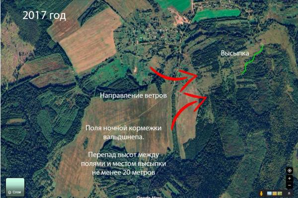 2017 рік – висипка на схилі бугра, досить далеко від будь-яких полів, не ближче 600 метрів. Вальдшнеп сидів по краю, в основному в ялиннику та заростях козячої верби. Також на краю корінного лісу – під великими ялинами. Якщо враховувати, що весь час лили дощі, ліс був мокрий, і я теж був весь мокрий, то десяток робіт на треку в 400 метрів давали підставу запам'ятати цю висипку як видатну. Протягом наступних двох років я перевіряв це місце неодноразово – ті самі середні 1–1,5 птахів на кілометр. Що за складної прохідності місця не мало жодного сенсу.