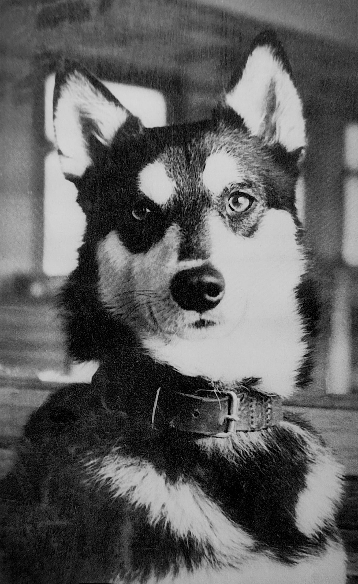 „З обіду”… Значить, повз собаку пройшли сотні моїх товаришів по службі. Це була чорно-ряба лайка бездоганно симетричного забарвлення, з різко окресленими білими щоками та білими брівками на чорній напівмасці. Пес і на мене не звернув жодної уваги, коли я нахилився до нього, лише пересмикнув брівками, як би кажучи: “Ну що ще тобі треба? Багато вас тут пройшло …”