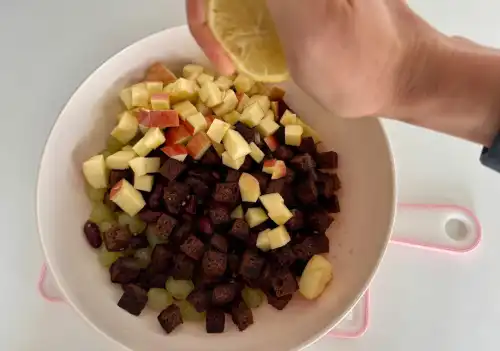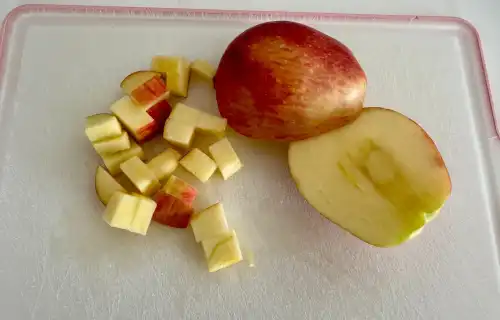 Яблуко нарізаю кубиками, але не дуже дрібно. Кубики повинні бути приблизно такого ж розміру, як виноградини.