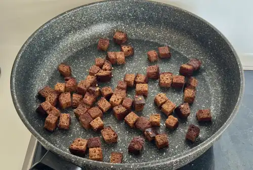 Хліб нарізаю невеликими кубиками — розміром приблизно 1 см × 1 см. Для обсмажування використовую лише одну столову ложку соняшникової олії. Постійно помішуючи, обсмажую хліб до рум’яної скоринки.