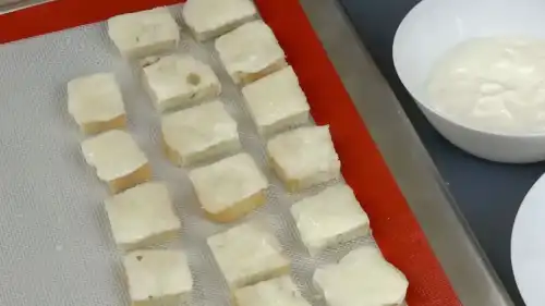 Подрібнені шматочки хліба занурюю однією стороною у сметану, потім у цукор. І розкладаю на лист. Можливо цукор поєднати з цинамоном і занурювати в сметану та в цукор з цинамоном. Смачно і так, і так.