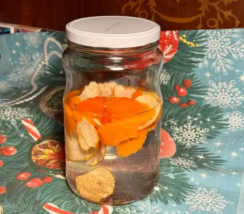Свіжі шкірки заливаємо горілкою. На 0,5 л горілки в мене пішли шкірки від приблизно 1 кг мандаринів – це близько 80-100 г шкірочок.